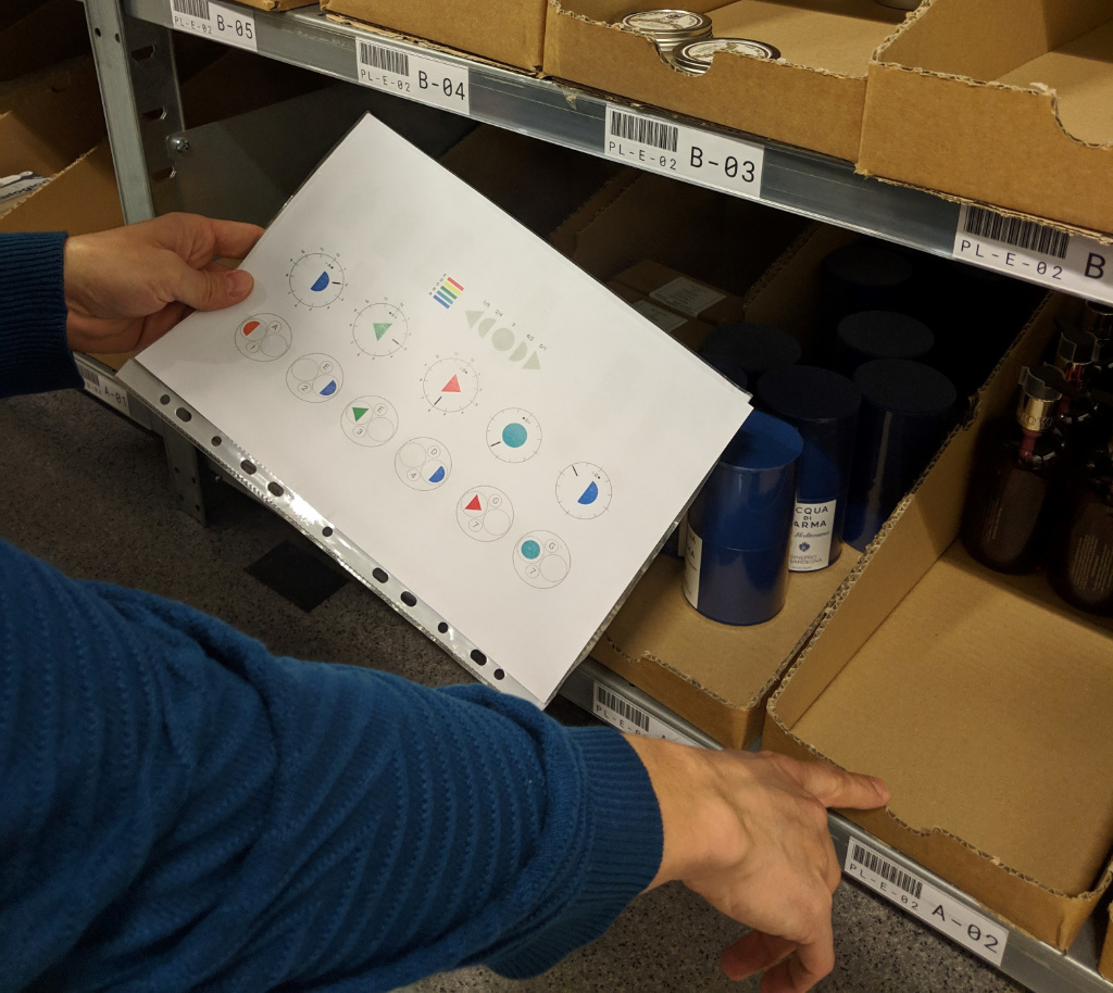 To evaluate the effectiveness in identifying correct item placement with the different location representations, we randomized the two different representation styles in 60 picking rounds. We identified 12 items in each round and 30 rounds with the original representation style, with letters and numbers, and 30 rounds with the representation style using colours and shapes. Picking times were then compared between the representation styles, showing on average a 14% increase in effectiveness using the shapes and colours.